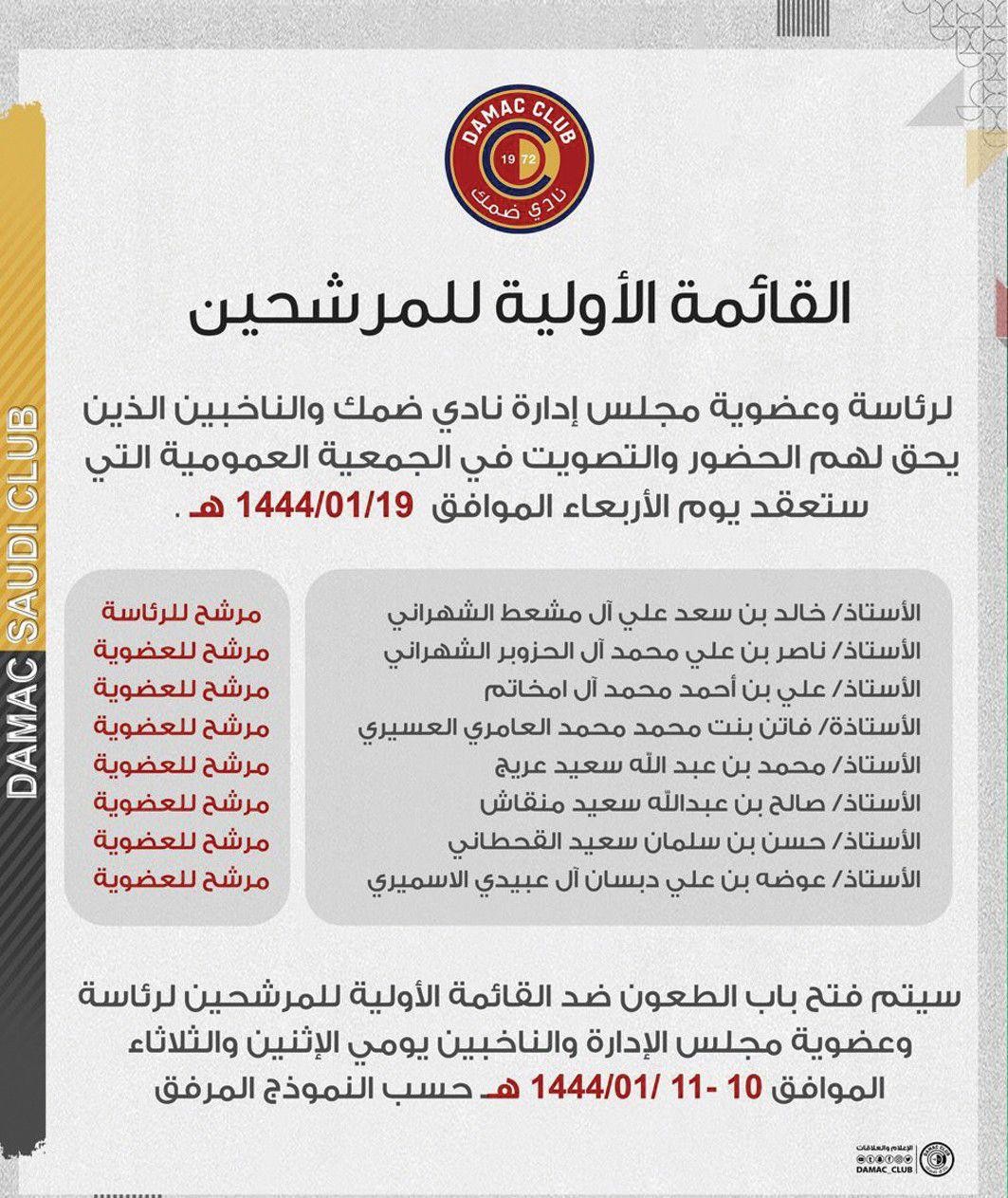 أعلنت اللجنة العامة لانتخابات الأندية الرياضية بوزارة الرياضة، القائمة الأولية للمرشحين لرئاسة وعضوية مجلس إدارة نادي ضمك، حيث تم استبعاد قائمة المرشح شاكر بن عوير من انتخابات رئاسة النادي. ونشر نادي ضمك عبر حسابه بموقع تويتر، القائمة التي ضمت خالد آل مشعط الشهراني كمرشح للرئاسة، وكلًا من ناصر آل الحزوبر الشهراني، علي أحمد آل امخاتم، فاتن محمد عسيري، محمد عبدالله عريج، صالح عبدالله منقاش، حسن سلمان القحطاني، عوضه علي الاسميري كمرشحين على عضوية المجلس.