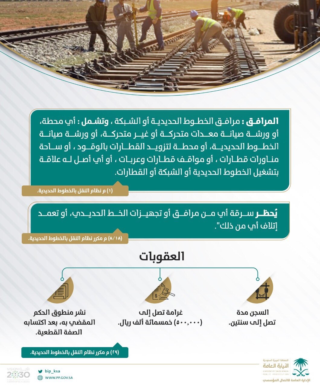 النيابة العامة: السجن سنتين وغرامة 500 ألف ريال عقوبة سرقة أي من مرافق أو تجهيزات الخط الحديدي