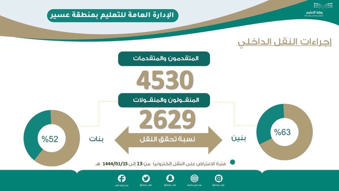 وأوضح مدير إدارة شؤون المعلمين محمد فايع ، أن عدد المتقدمين بلغ 2083 متقدما، وبلغ عدد المنقولين 1324 معلما وبنسبة بلغت 63% ، وبلغ عدد المتقدمات 2447 متقدمة ، وبلغ عدد المنقولات 1296 معلمة، بنسبة 52%، لافتا إلى أنه يمكن الاستعلام من خلال حسابات المعلمين والمعلمات في نظام نور، كما يمكنهم الاعتراض إلكترونيًا في ذات البرنامج حتى 1444/1/15 مشيرا إلى أن إجراءات النقل الداخلي تمت وفقًا لنظام الوزارة والآليات المتبعة نظاما.