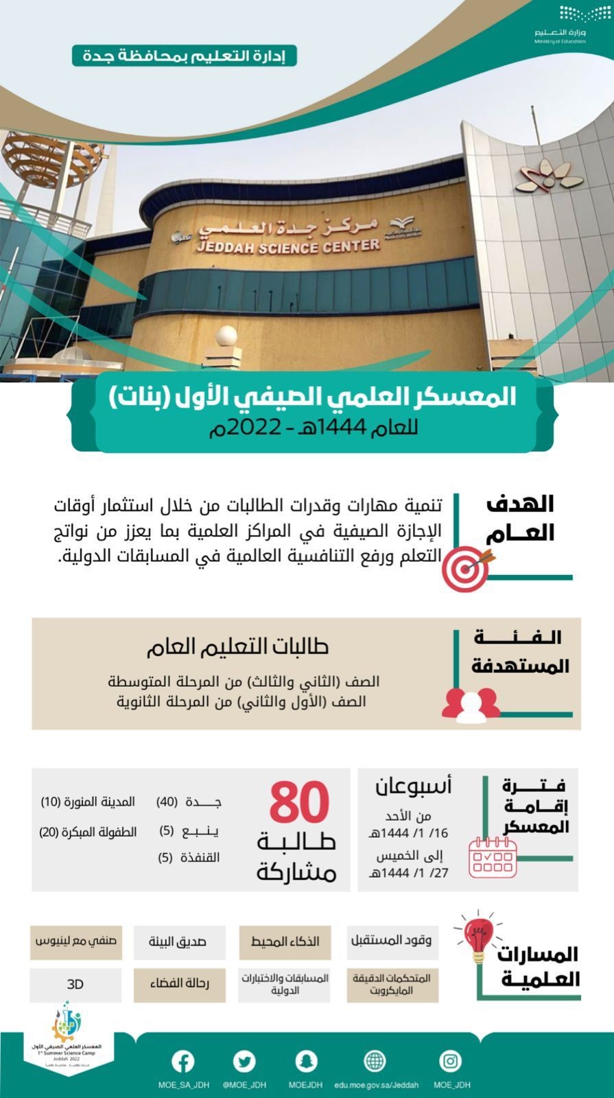 وأوضحت مساعدة مدير عام تعليم جدة للشؤون التعليمية " بنات " منال اللهيبي أن المعسكر يستهلّ فعالياته غداً "الأحد" وذلك من خلال تنفيذ العديد من البرامج والورش التدريبية المختلفة التي تعمل على استثمار العقول والطاقات البشرية أثناء الإجازة الصيفية في مجالات الرياضيات والتكنولوجيا والعلوم والهندسة والفنون المختلفة وذلك ضمن مسارات علمية رئيسة للورش التدريبية ومنها وقود المستقبل ، المتحكمات الدقيقة المايكروبت وكذلك الذكاء المحيط والمسابقات والاختبارات الدولية و صديق البيئة و رحالة الفضاء صنفي مع لينيوس و3D.