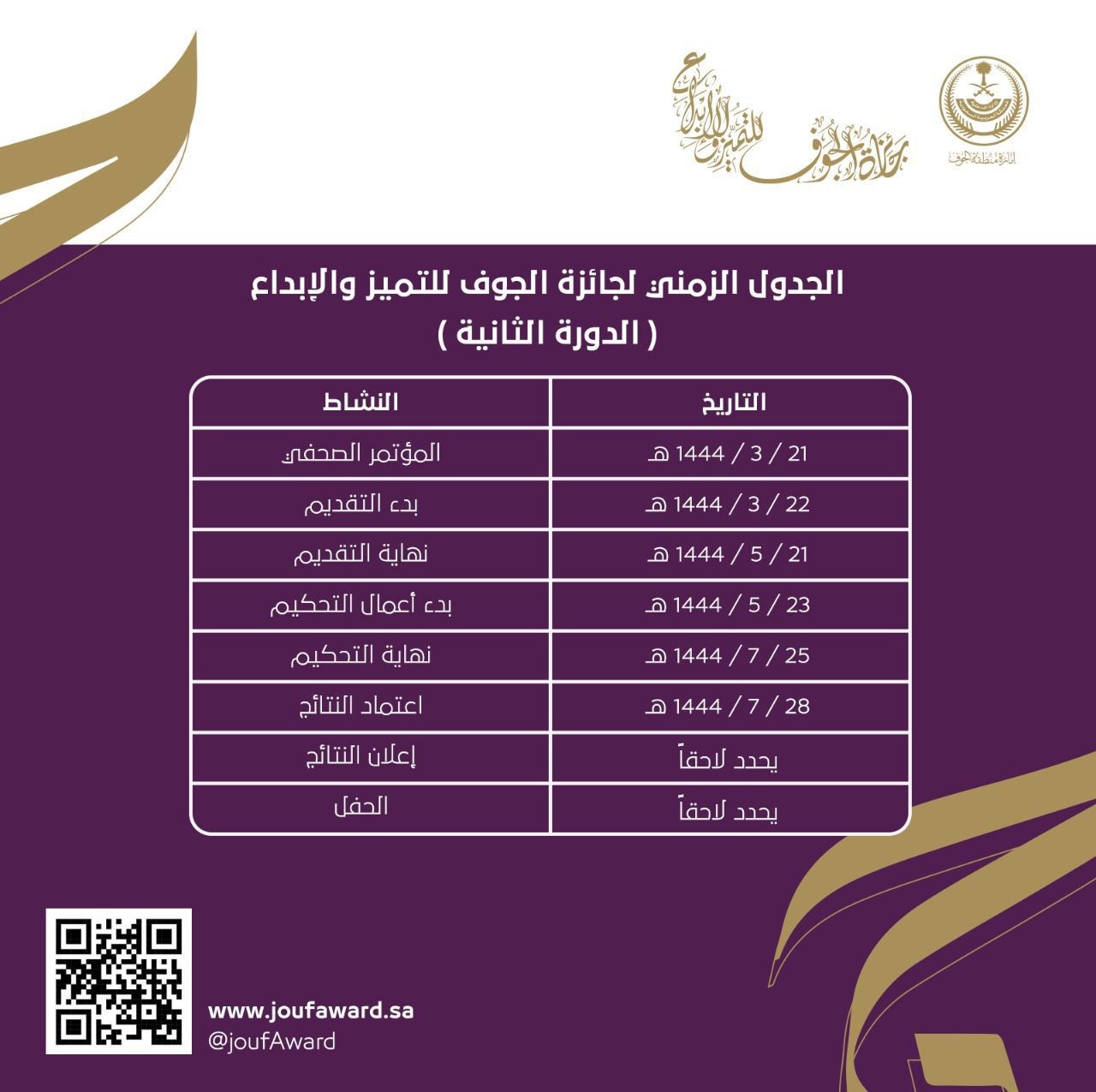 الأمانة العامة لجائزة الجوف للتميز والإبداع تعلن الجدول الزمني للدورة الثانية للجائزة .