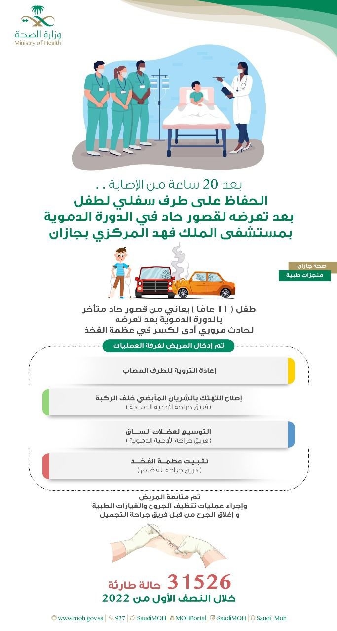 قالت صحة جازان بأن فريقاً طبيًّا من قسم جراحة الأوعية الدموية بمستشفى الملك فهد المركزي بجازان تمكّن من المحافظة على الطرف السفلي لطفل يبلغ من العمر إحدى عشر عامًا كان سببه قصور حاد في الدورة الدموية.