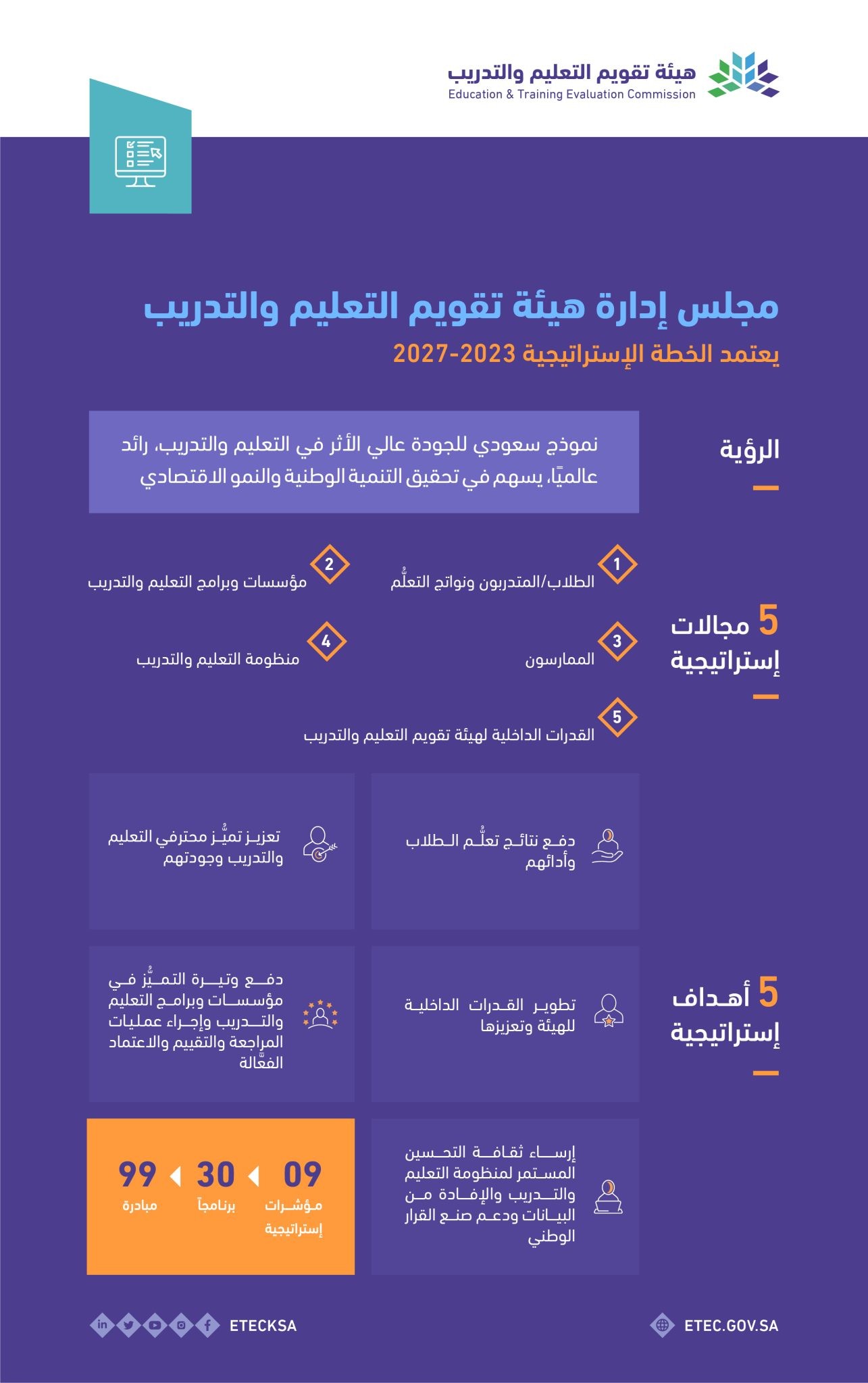 وجاءت الأهداف الإستراتيجية لتحسين نتائج تعلم الطلاب وأدائهم من خلال معايير المناهج الحديثة والتقييمات، وتعزيز تميز وجودة محترفي التعليم والتدريب بوضع معايير أعلى ومنح التراخيص، ودفع وتيرة التميز في مؤسسات وبرامج التعليم والتدريب، وذلك بإجراء عمليات المراجعة والتقييم والاعتماد الفعالة، إضافة إلى إرساء ثقافة التحسين المستمر لمنظومة التعليم والتدريب، وتقديم المشورة القائمة على البيانات لدعم صناعة القرار الوطني، وتطوير وتعزيز القدرات الداخلية للهيئة، كما تضمنت الخطة عددًا من المبادرات والمشاريع، ومؤشرات الأداء والمستهدفات التي تندرج تحت برنامج التقويم الوطني للتحصيل التعليمي، وبرنامج التقويم الوطني للتحصيل الجامعي، وبرنامج التقويم الوطني للتدريب.