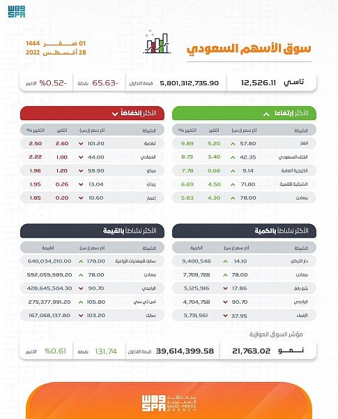 أغلق مؤشر الأسهم السعودية الرئيس اليوم منخفضًا 65.63 نقطة ليقفل عند مستوى 12.526.11 نقطة, بتداولات بلغت قيمتها 5.8 مليارات ريال.