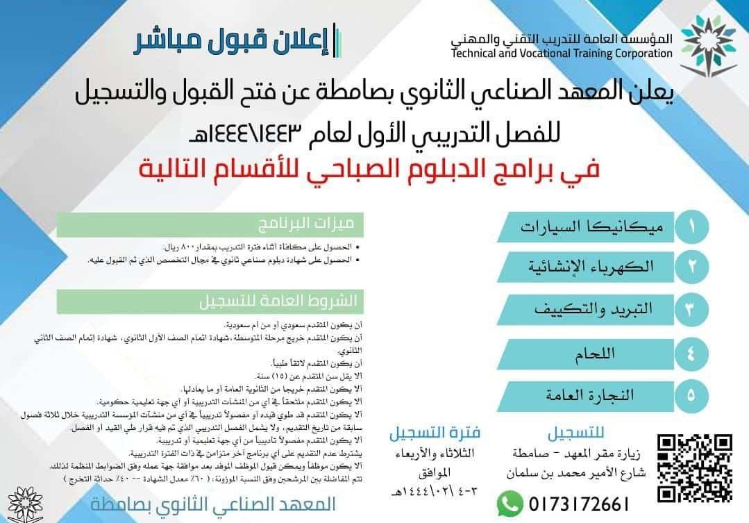 يبدأ المعهد الصناعي الثانوي بمحافظة صامطة غدا، القبول المباشر للفصل التدريبي الأول لعام ١٤٤٣/ ١٤٤٤هـ في برامج الدبلوم الصباحي، وذلك بمقر المعهد .
