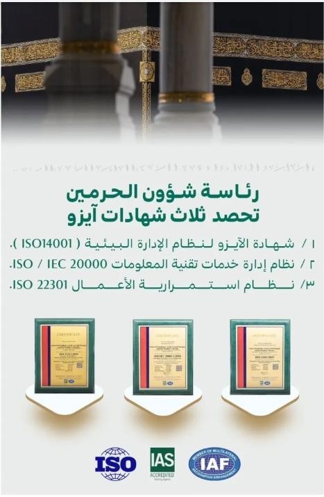عبدالرحمن بن عبدالعزيز السديس: أن حصول الرئاسة العامة لشؤون المسجد الحرام والمسجد النبوي على شهادات (الآيزوا) العالمية يجسد الريادة الحضارية للقيادة الرشيدة في تطوير منظومة الخدمات للحرمين الشريفين وقاصديهما