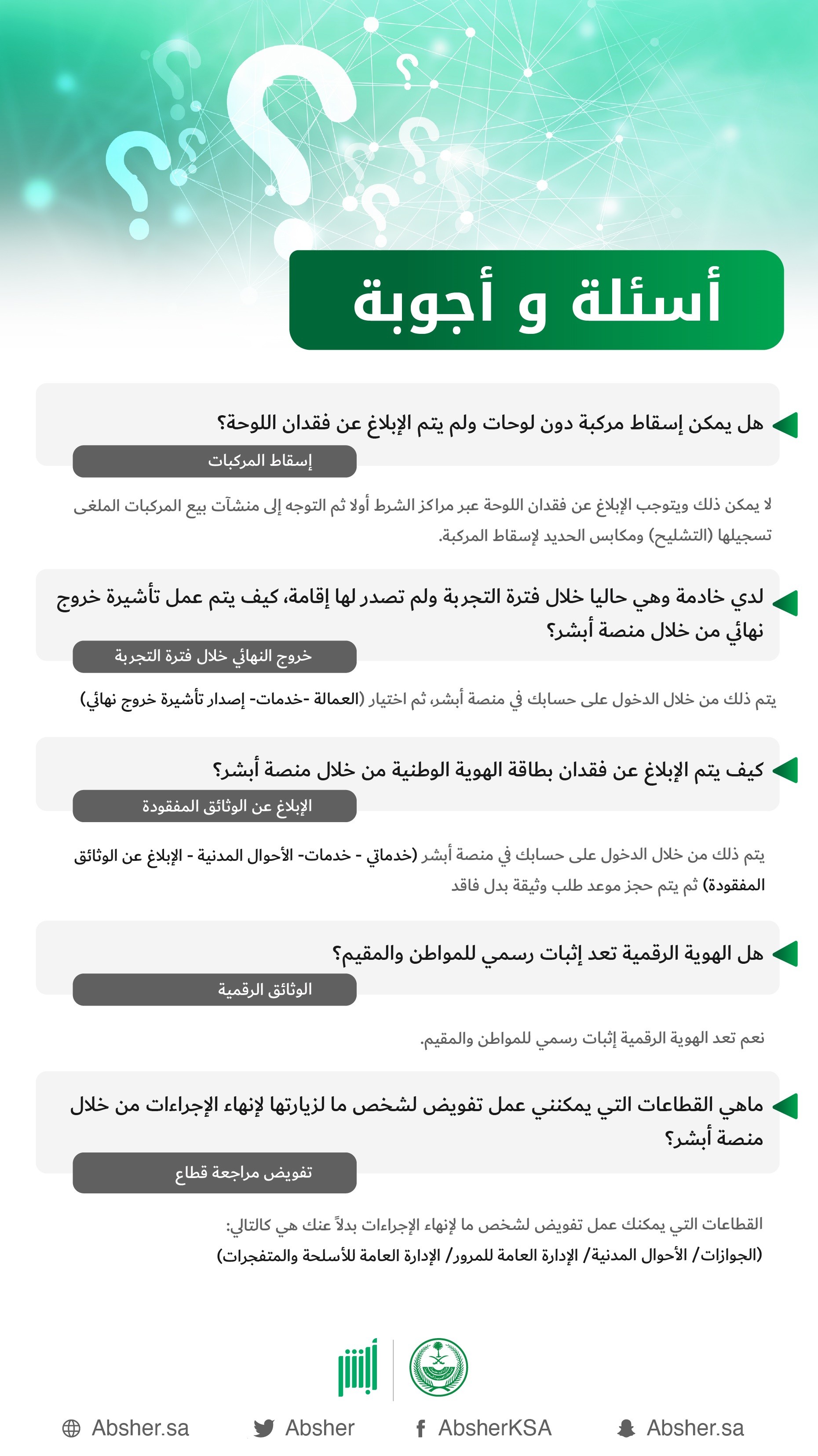 أوضحت منصة أبشر التابعة لوزارة الداخلية، أبرز الأسئلة الأكثر استفسارًا من قبل المستفيدين حول خدماتها.