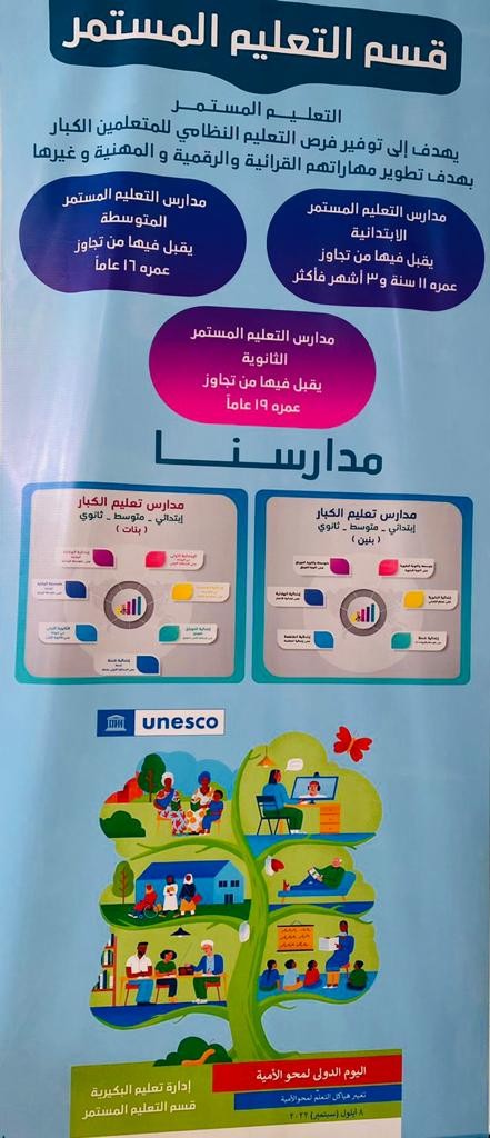 شاركت إدارة التعليم بمحافظة البكيرية ممثلة بقسم التعليم المستمر "بنين-بنات" بالاحتفاء باليوم العالمي لمحو الأمية تحت شعار "تغيير هياكل التعلم لمحو الأمية " .