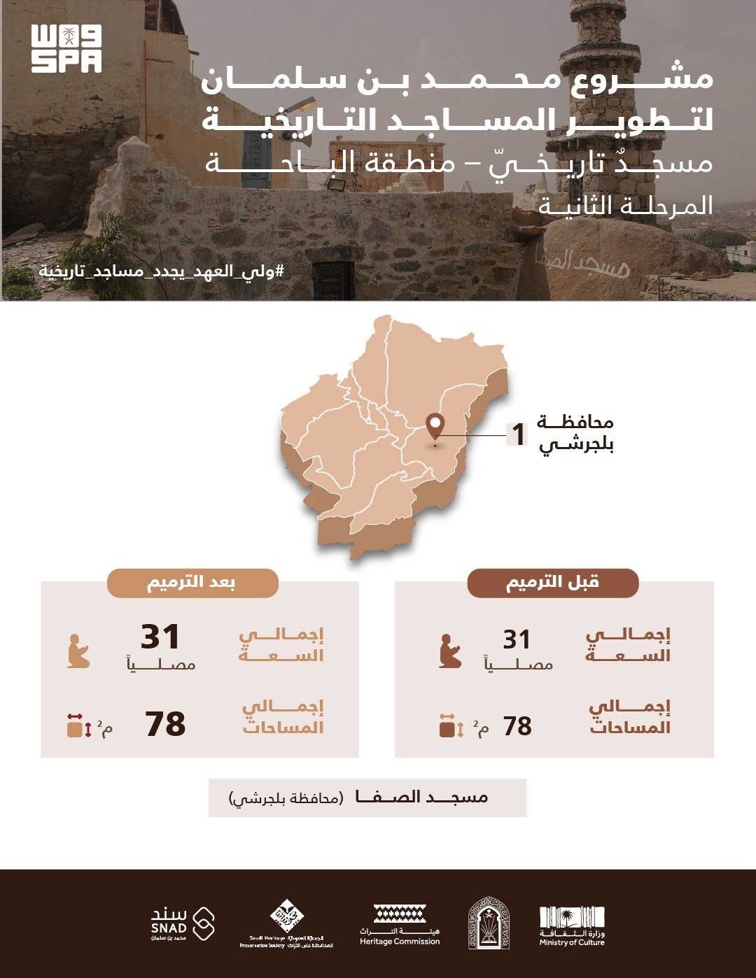 وضمن أعمال المشروع في حماية مساجد منطقة الباحة، ورعاية خصائصها الفنية وهندستها المعمارية، إخضاع مسجد الصفا الواقع بوسط محافظة بلجرشي للتطوير، وهو أحد أقدم مساجد المملكة، إذ كان بناؤه في القرن الهجري الأول، قبل أكثر من 1350عام.