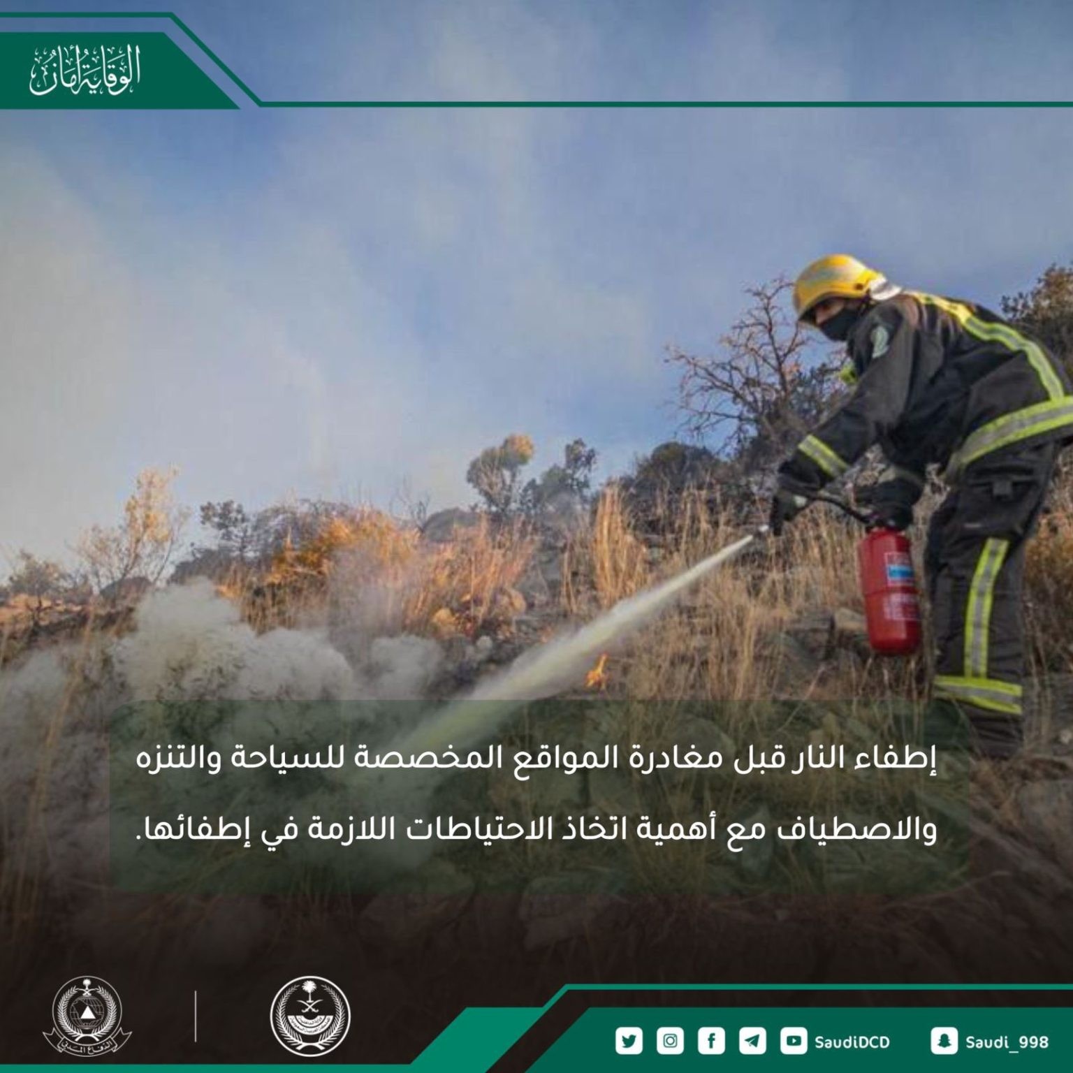 شدد الدفاع المدني، على ضرورة إطفاء النار قبل مغادرة المواقع المخصصة للسیاحة والتنزه والاصطیاف مع أھمیة اتخاذ الاحتیاطات اللازمة في إطفائھا.