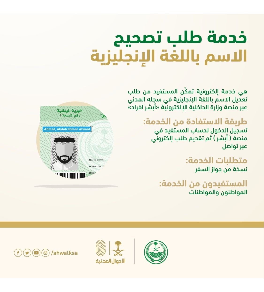 أعلنت الأحوال المدنية عن أتاحت خدمة تعديل الاسم باللغة الإنجليزية إلكترونيًا عبر منصة أبشر.