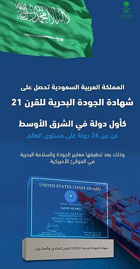 حصلت المملكة على شهادة الجودة البحرية (USCG) للقرن الحادي والعشرين كأول دولة في الشرق الأوسط ومن بين 26 دولة فقط على مستوى العالم، وذلك لتحقيقها معايير الجودة البحرية في الموانئ الأمريكية.