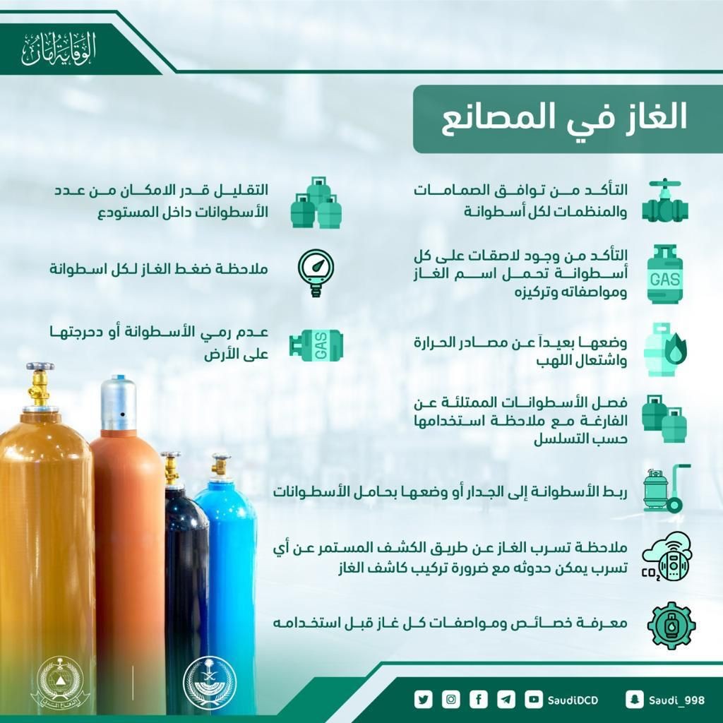 نشرت المديرية العامة للدفاع المدني عبر حسابها الرسمي في تويتر إنفوجرافك يتضمن خطوات يجب اتباعها عند استخدام الغاز في المصانع .