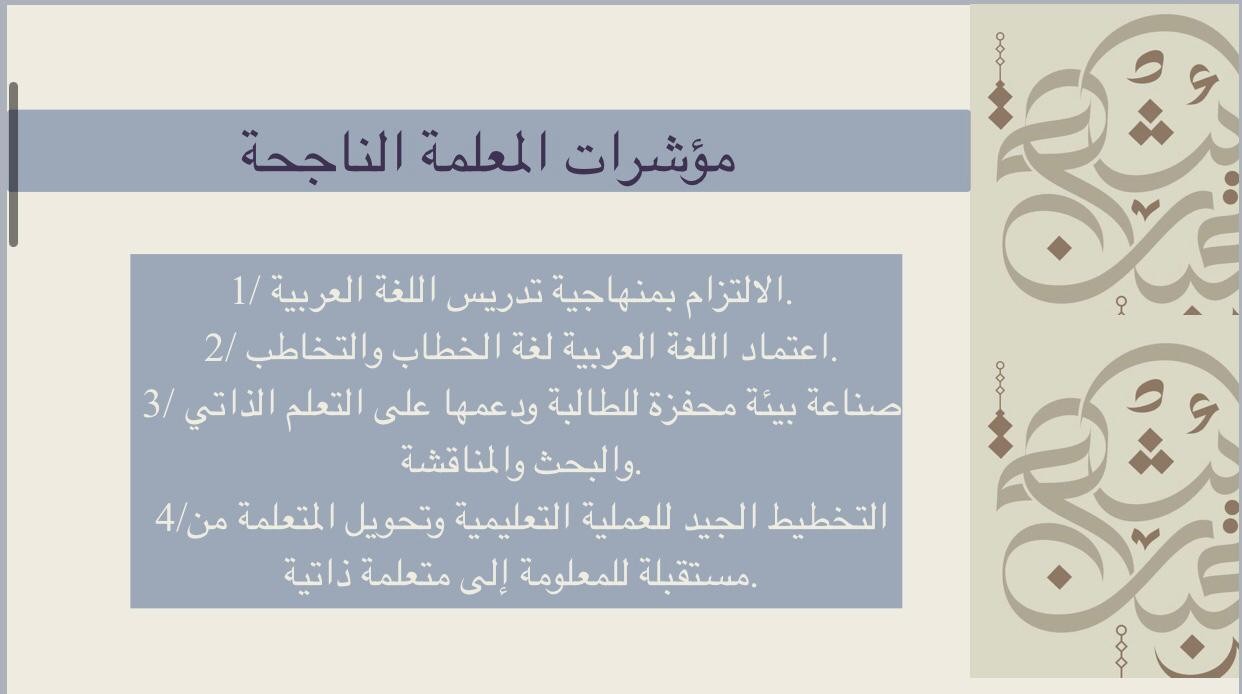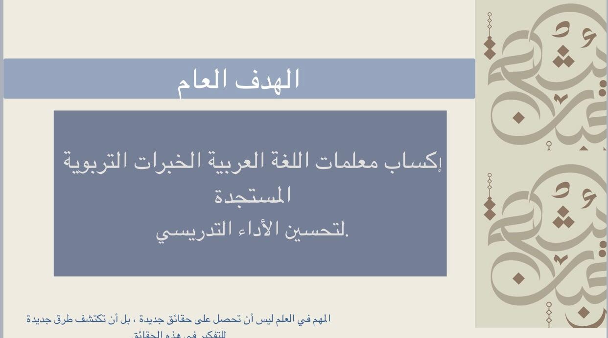 هدف البرنامج إلى إكساب معلمات اللغة العربية الخبرات التربوية المُستجدة؛ لتحسين الأداء التدريسي، حيثُ تم توضيح منهجية تدريس اللغة العربية، وشرح آلية التحضير الإلكتروني، كذلك تفعيل أيقونات المنصة، كما تم التأكيد على أهمية ملف المادة والمجتمعات المهنية لتوثيق كل ما يستجد، وإيضاح اللائحة التفسيرية في تقويم الطالب، وإبراز قيمة المبادرات ودورها الفاعل في حفظ الإنتاج المعرفي.