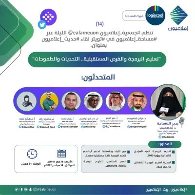 وتتناول محاور اللقاء تعليم البرمجة في المراحل الابتدائية ورؤية 2030. دور الإباء والامهات لدعم أبنائهم لتعلم البرمجة كلغة مستقبلية مهمة. أهمية تعليم البرمجة للأطفال من عمر مبكرة. والعمر المناسب لتعليم البرمجة للأطفال واليافعين.