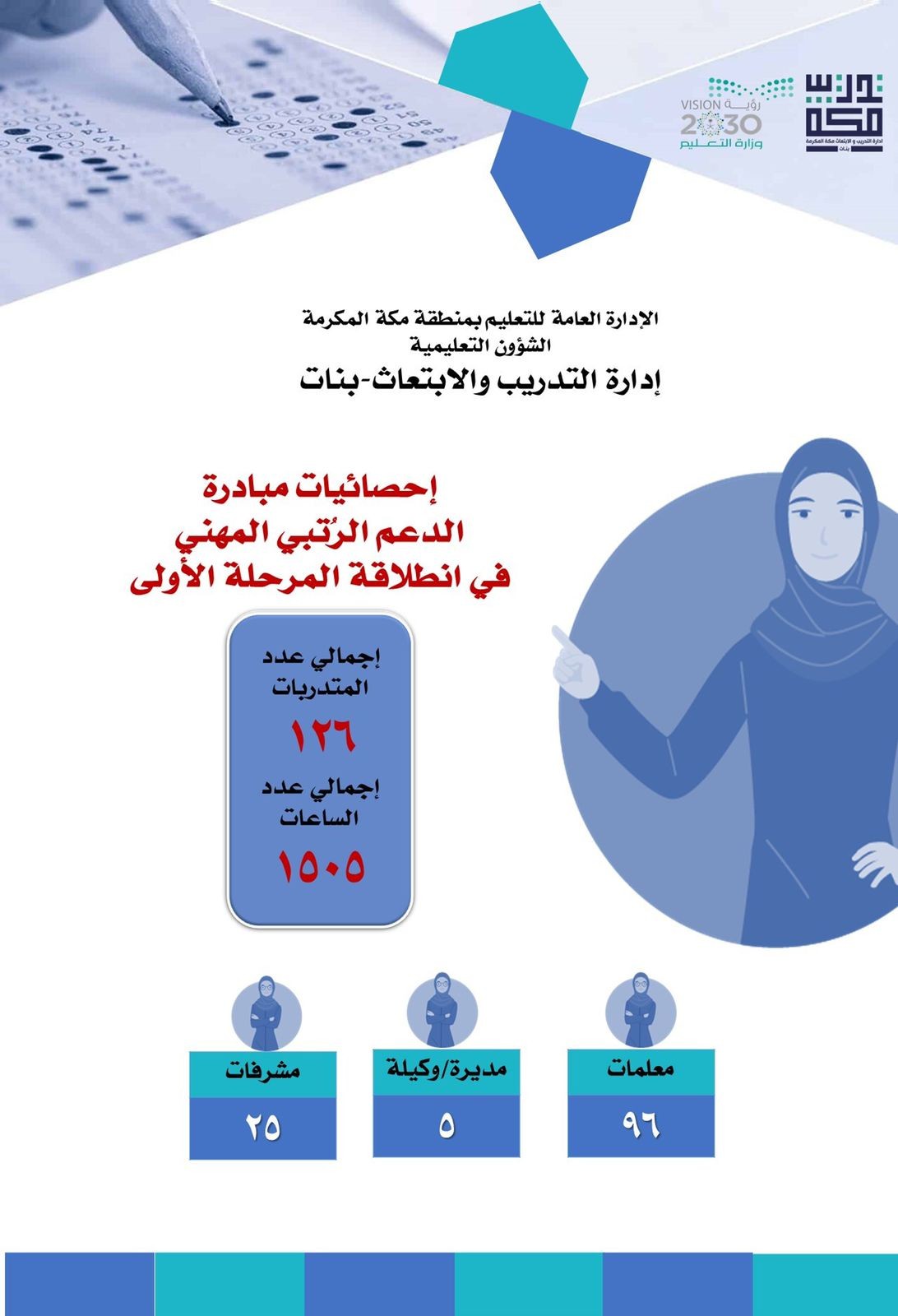 هذا وتتضمن المبادرة سلسلة من البرامج والورش واللقاءات التدريبية والمهنية التي تبدأ بالتدريب على المجال التربوي ثم التخصصي، وذلك بواقع (126) متدربة في المرحلة الأولى للانطلاق منهن ( 93 ) معلمة، و( 25 ) مشرفة تربوية، و( 4 ) مديرات مدارس، ووكيلة واحدة ، و( 3) مرشدات طلابيات