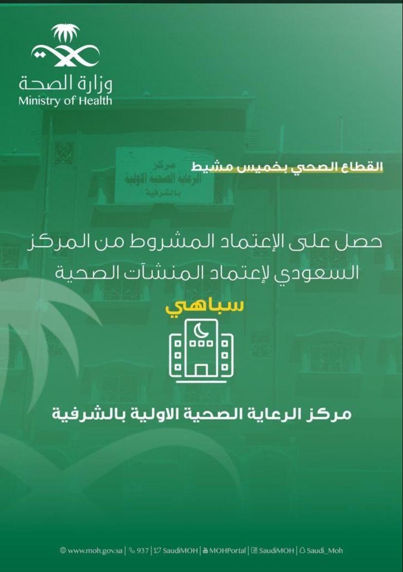 حصل مركز صحي الشرفية التابع لقطاع صحي خميس مشيط على ( اعتماد مشروط ) من قبل المركز السعودي لاعتماد المنشاءات الصحية ( cbahi) وهو احد اهم الاهداف التي نسعى الى تحقيقها والتي تتمثل في الالتزام بتقديم خدمات صحيه شاملة وآمنه المحتوى بكفاءات ومعايير عالميه وضمان لسلامه المرضى من خلال الالتزام بالمعايير والرضاء الوظيفي والتحسين المستمر *