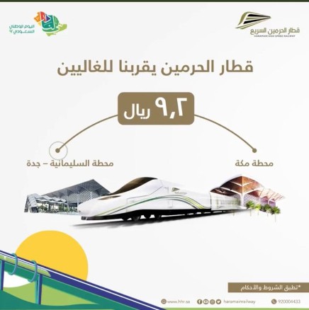 أعلن خدمة العملاء لقطار الحرمين، أنه بمناسبة اليوم الوطني الـ 92، فإن التذكرة بـ 9.2 ريال على الدرجة الاقتصادية للرحلات بين محطة مكة المكرمة ومحطة جدة بالسليمانية.