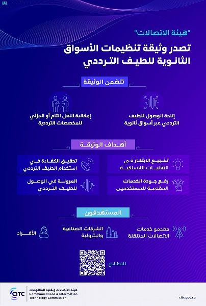 أصدرت هيئة الاتصالات وتقنية المعلومات، وثيقة تنظيمات الأسواق الثانوية للطيف الترددي، تنفيذاً لمبادرات الإستراتيجية الوطنية للطيف الترددي (2020-2025) التي تتبنى الأساليب التنظيمية المرتكزة على الأسواق واحتياجات المستخدمين.