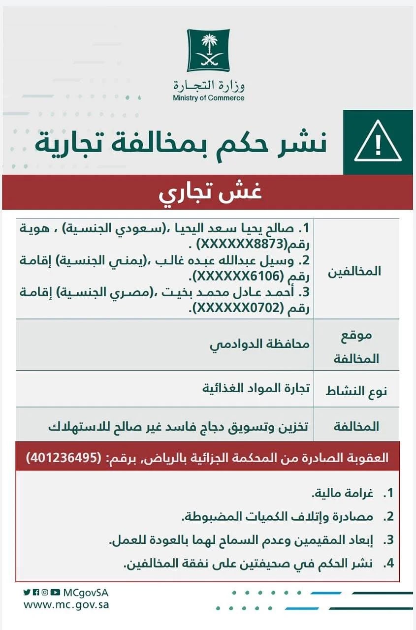 شهَّرت وزارة التجارة بثلاثة مخالفين مواطن ومقيمين من الجنسية اليمنية والمصرية بعد صدور حكم قضائي يدينهم بمخالفة نظام مكافحة الغش التجاري من خلال نقل وتخزين وتسويق دجاج فاسد غير صالح للاستهلاك وهو ما يعدُّ مخالفة تستوجب العقوبة بالنظر لخطورة المنتجات الغذائية المغشوشة على صحة وسلامة المستهلك.