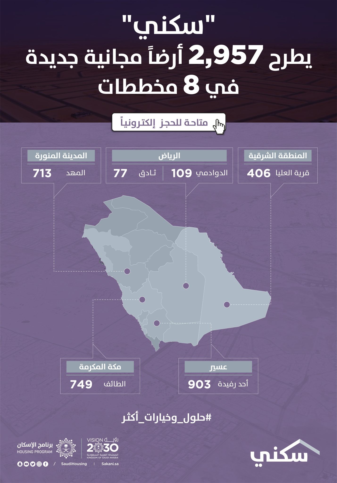 طرح برنامج سكني 2,957 أرضاً مجانية جديدة في 8 مخططات سكنية، وذلك ضمن الحلول والخيارات السكنية التي يتيح حجزها إلكترونياً بإجراءات سهلة وميسرة، داعياً المستفيدين الراغبين بخيار الحصول على أرض إلى زيارة الموقع الإلكتروني من خلال الرابط https://sakani.sa أو تحميل تطبيق الأجهزة الذكية، في إطار سعيه إلى تعزيز المعروض العقاري عبر حلول إلكترونية تسهل على المواطنين رحلة إيجاد المسكن الأول.