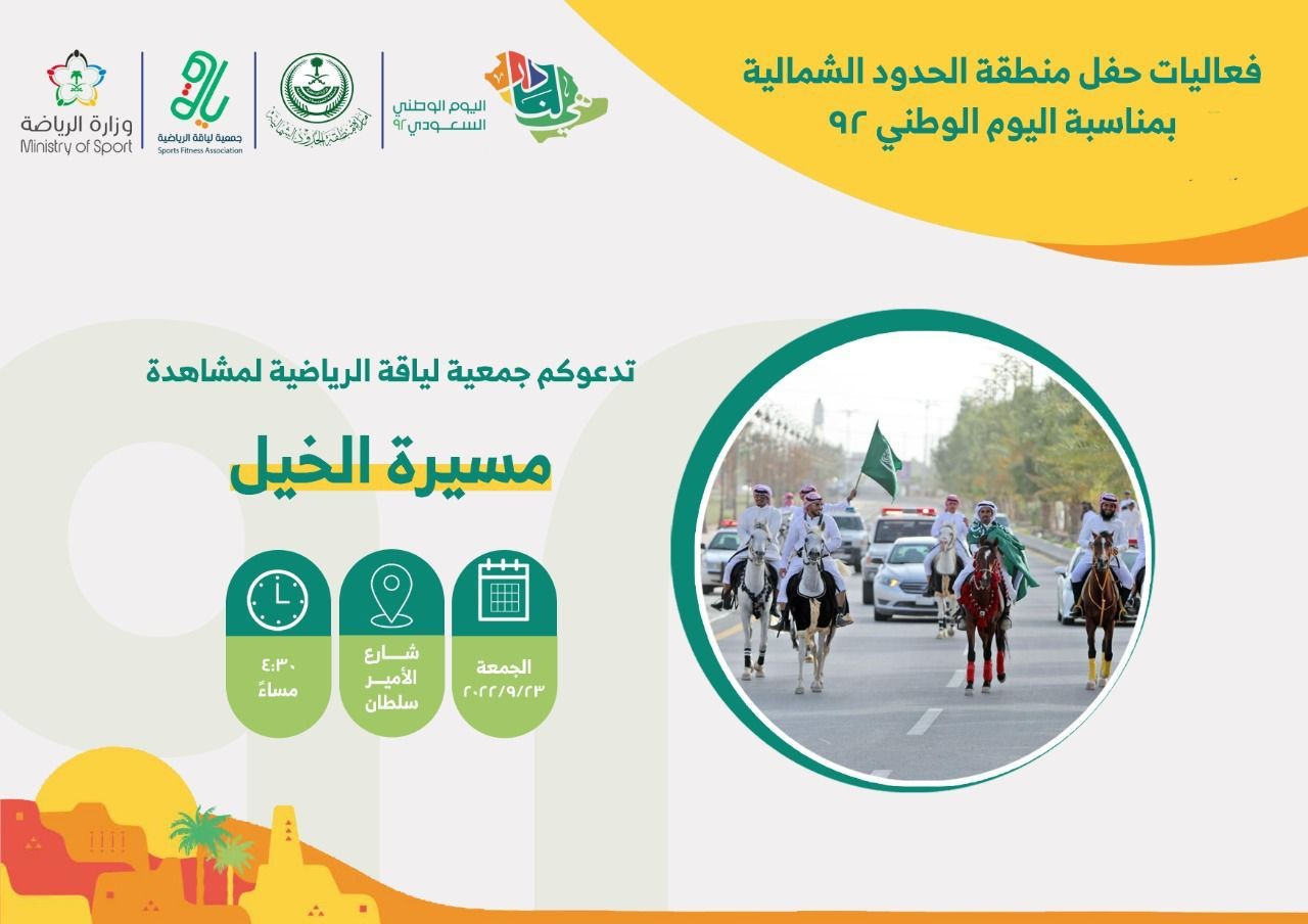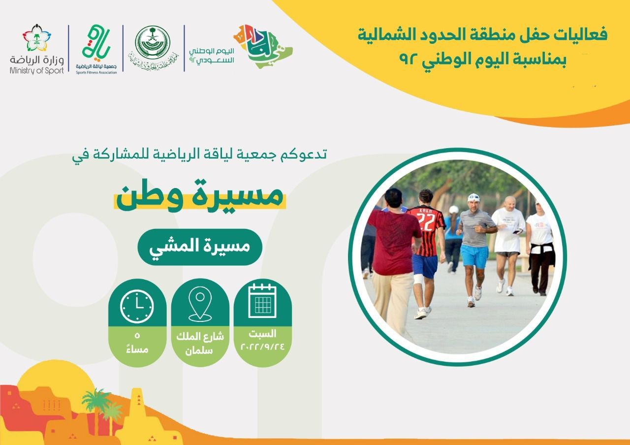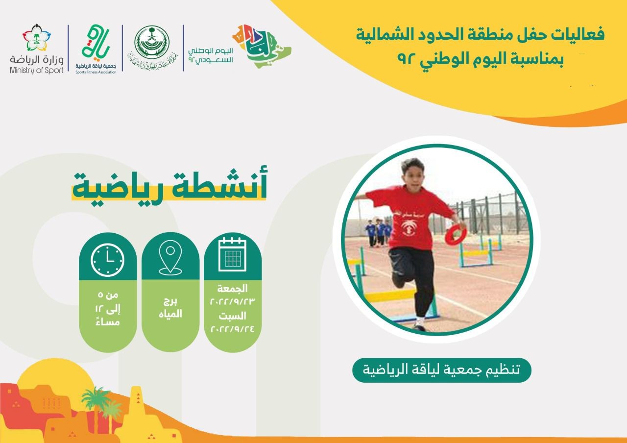 اطلقت فعاليات الحدود الشمالية بمناسبة "اليوم الوطني 92 “ تحت شعار "هي لنا دار " فعاليات وبرامج رياضية تهدف إلى إشراك كافة فئات المجتمع ،وتعزز الانتماء إلى وطنهم الغالي ،تماشياً مع تطلعات القيادة الرشيدة في تحقيق الأهداف رؤية المملكة العربية السعودية " 2030 " .