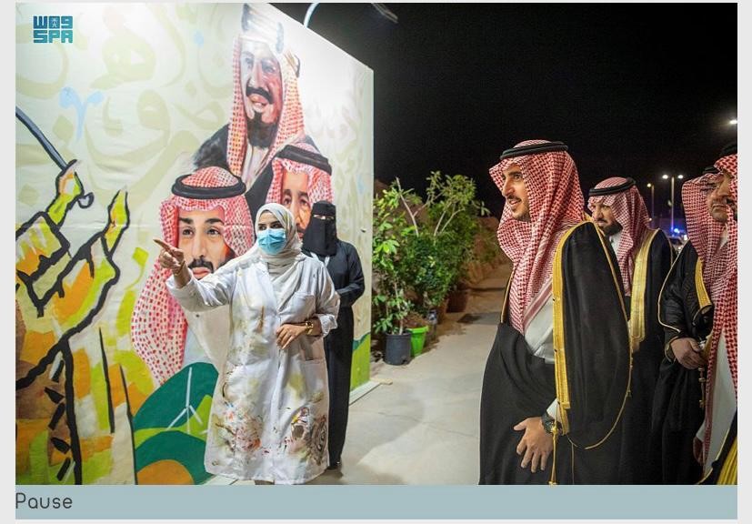 وكان في استقبال سموه فور وصوله أمين منطقة الجوف المهندس عاطف بن محمد الشرعان، حيث قام سموه بجولة على جدارية الفن التشكيلي، واطلع على ما اشتملت عليه من لوحات وأعمال فنية صاغ من خلالها أبناء وبنات المنطقة التشكيليون عددًا من الصور الوطنية واللوحات التعبيرية بهذه المناسبة العزيزة المعبرة عن حبهم لوطنهم ومليكهم.