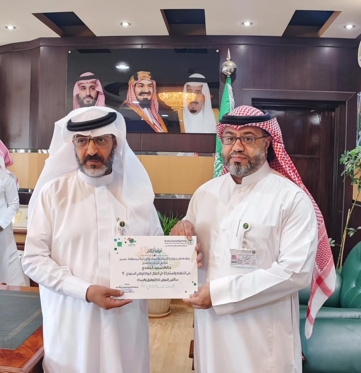 من جهة أخرى كرم المهندس عبدالله الويمني اليوم في مكتبه الفريق العمل المشارك في تنظيم فعاليات اليوم الوطني الثاني والتسعون, حيث قدم لهم شكره وتقديره على الجهود التي بذلوها خلال هذه الفترة, يذكر ان فرع وزارة البيئة والمياه والزراعة بمنطقة عسير قد شارك بالتعاون مع امانة منطقة عسير وإدارة تعليم عسير في عدد من الفعاليات احتفاء بهذه المناسبة.