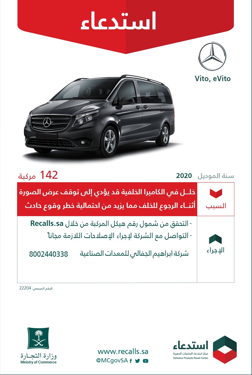 أعلنت وزارة التجارة، اليوم الاثنين، عن استدعاء 142 مركبة مرسيدس “Vito / eVito” “2020”.