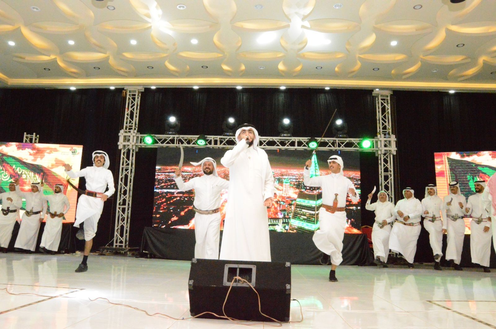 ثم تنوعت الفقرات التي استهلت بالقرآن الكريم ثم بمشاركة أطفال روضة كناري وعروض مرئية تحاكي إنجازات المؤسس الملك عبدالعزيز بن عبدالرحمن الفيصل طيب الله ثراه وأبناؤه من بعده في لم الشمل وتوطيد الأمن والاستقرار وتوحيد البلاد تحت راية التوحيدالخالدة ، تم تابع الجميع عرض فيلم من إعداد وتقديم شباب المحافظة وأوبريت وطني شعبي من تقديم فرقة شباب سحر آل عاصم، حيث شارك المحافظ الأهالي الألوان الشعبية احتفالاً وابتهاجاً بهذه المناسبة الغالية على الجميع.
