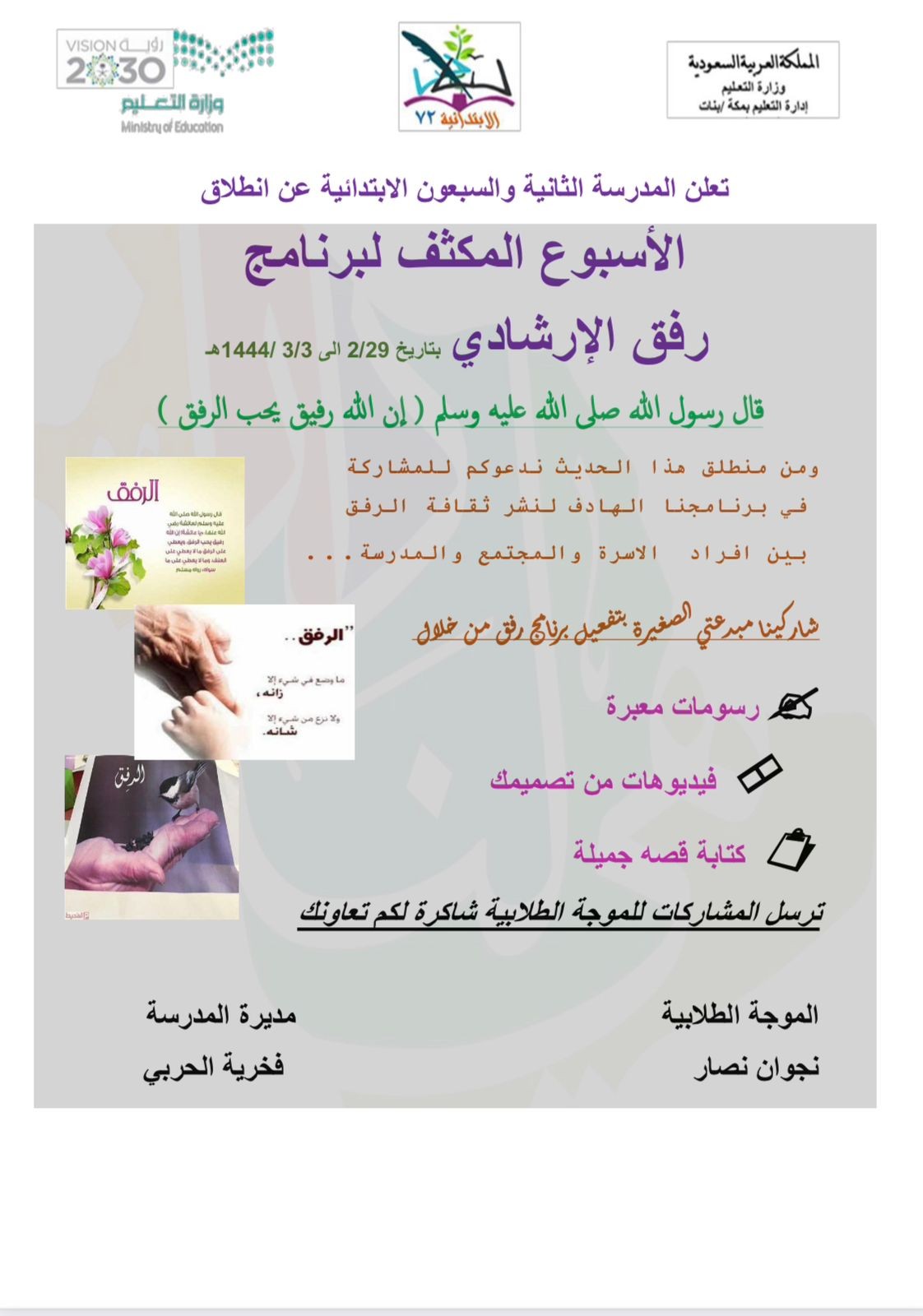 فعلت الابتدائية الثانية والسبعون التابعة لمكتب تعليم غرب مكة بالإدارة العامة للتعليم بمنطقة مكة لمكرمة ولمدة أسبوع من الأحد إلى الخميس 29/2-3/3 /1444هـالبرنامج الإرشادي رفق وذلك بهدف التعريف بالبرنامج ونشر ثقافة رفق في مدارس التعليم العام، نفذته المرشدة الطلابية نجوان نصار تحت إشراف القائدة فخرية الحربي.