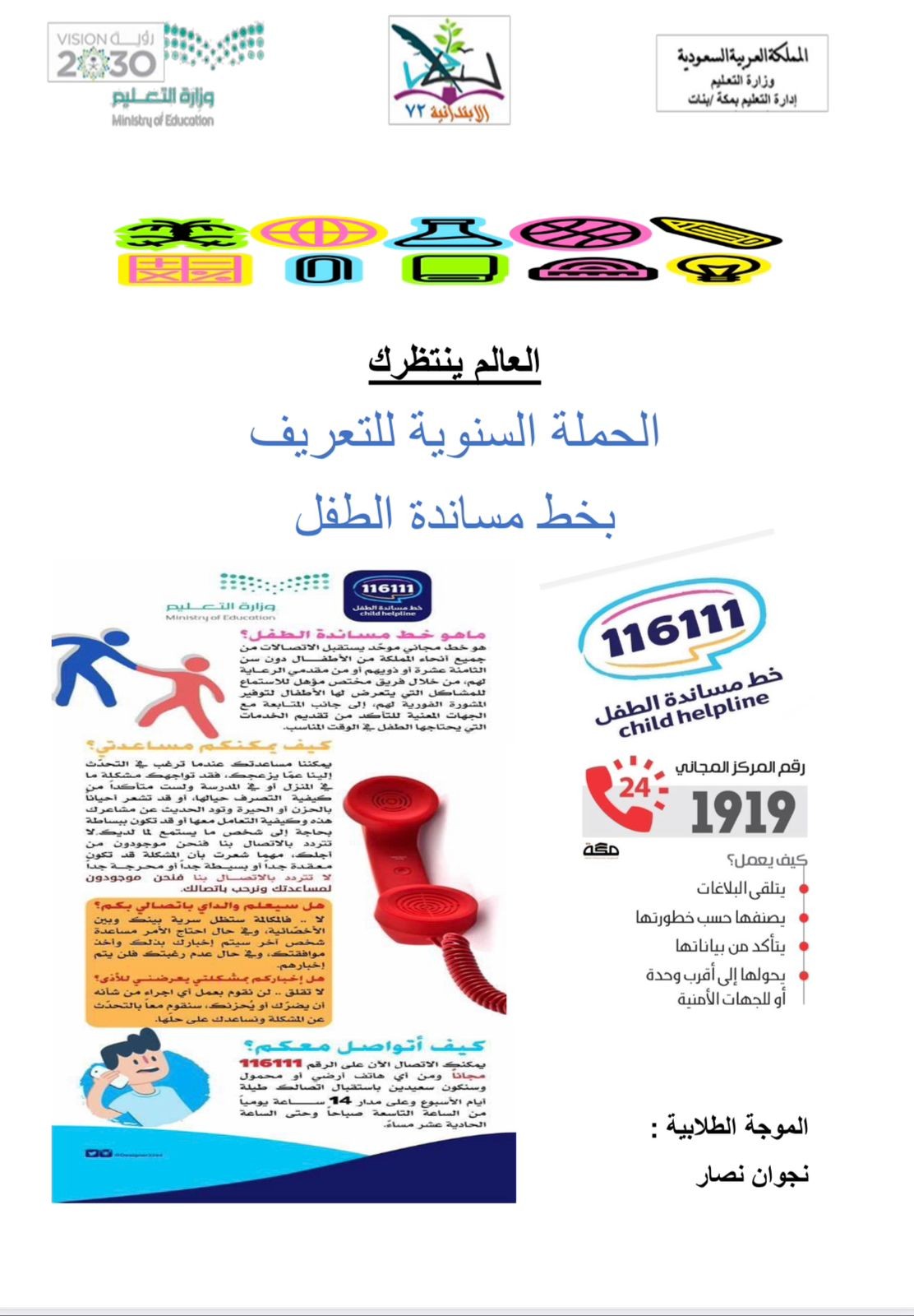 وخصصت الحصة الأولى من اليوم الدراسي عن البرنامج لتوفير بيئة تربوية وأسرية مناسبة للطالبات بما يحقق لهم حياة آمنة، كما بصرت الطالبات والعاملات في المدرسة وأولياء الأمور بمفهوم مشكلة التنمر وكيفية التعامل معها في ضوء اللوائح السلوكية والتعريف بأساليب التدخل المبكر والعلاج لتلك المشكلة، وتمت التوعية لأولياء الأمور خلال مجلس للأمهات عبر وسائل التواصل الاجتماعي.