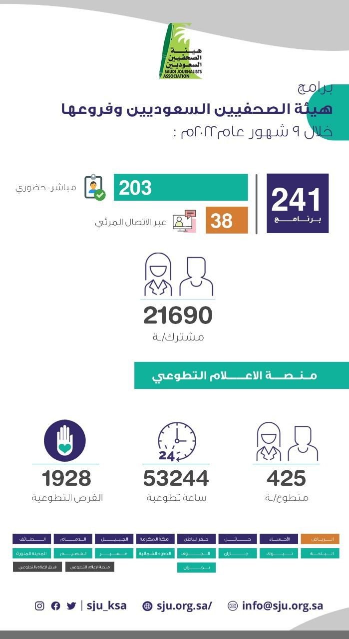 نفذت هيئة الصحفيين السعوديين وفروعها في مناطق و محافظات المملكة في الفترة من شهر يناير إلى سبتمبر من العام الجاري 2022م 241 برنامج " متنوعة صوالين إعلامية ، وورش عمل ، وحلق إثرائية ، وحلقات نقاش ، ويرامج تدريبية ، ولقاءات ، ومؤتمرات صحفية ، ولقاءات أخوية ترفيهية " منها 203 فعالية حضورية و 38 فعالية عبر الإتصال المرئي .