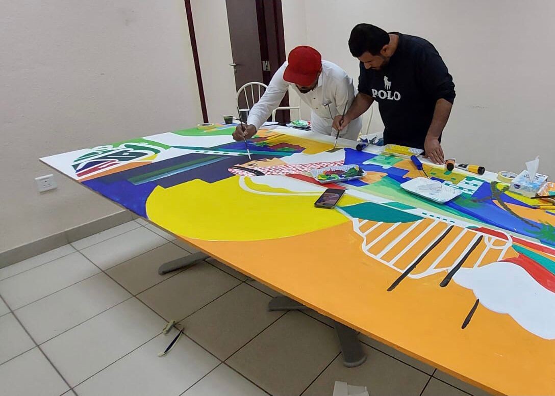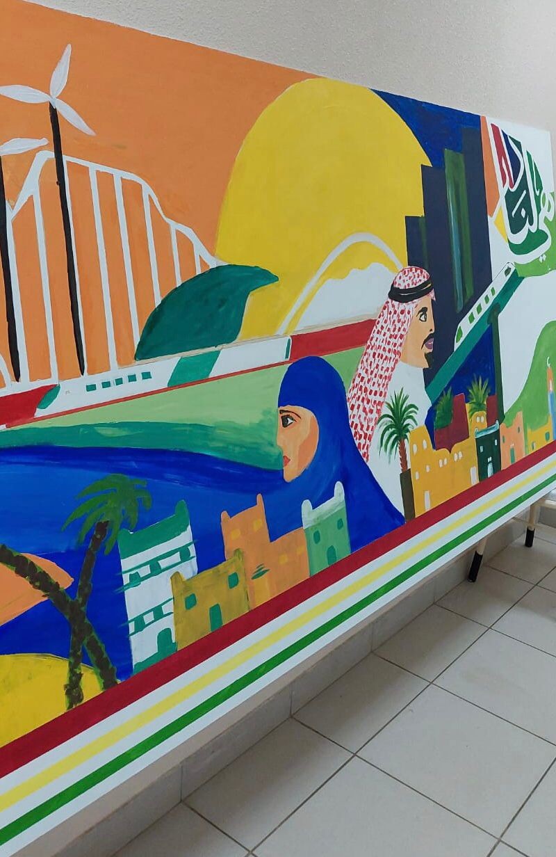 ضمن احتفالاتها باليوم الوطني نفذت الجمعية السعودية للفنون التشكيلية بعسير لوحات جدارية بدار الرعاية الاجتماعية بأبها في قسمي الرجال والنساء، شارك فيها عدد من نزلاء المركز والنزيلات، وموظفي الدار وموظفاتها.