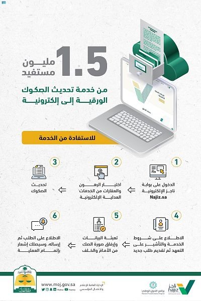 كشفت وزارة العدل أن عدد المستفيدين من خدمة تحديث الصكوك الورقية إلى إلكترونية، تجاوز الـ 1.5 مليون مستفيد، في ظل تطوير الخدمة وتحسين جودتها من خلال تسهيل و تبسيط الإجراءات.