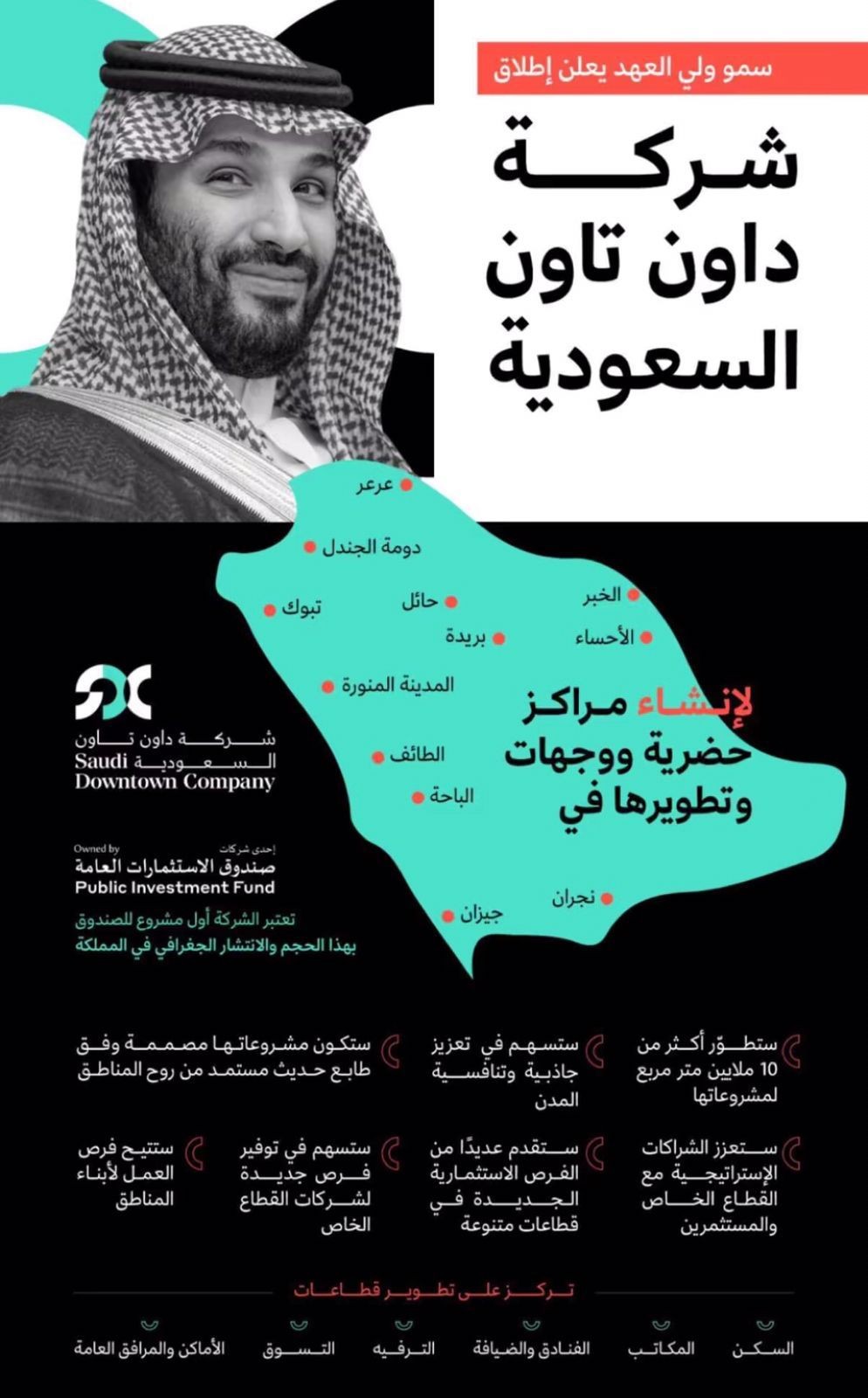 إطلاق شركة “داون تاون السعودية”، والتي تهدف لإنشاء وتطوير مراكز حضرية ووجهات متعددة ومتنوعة في أنحاء المملكة.