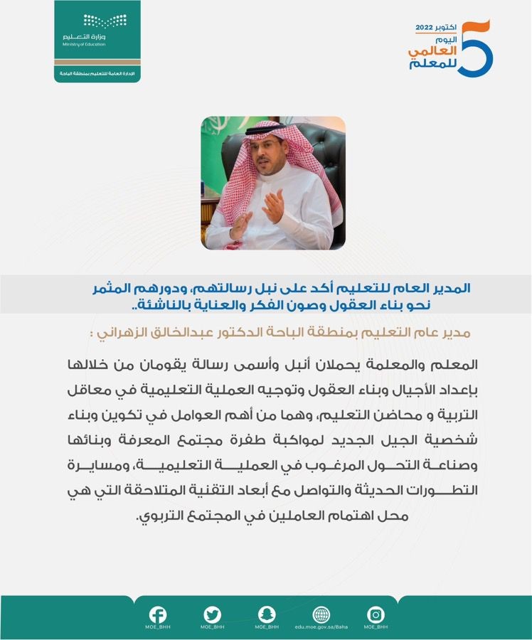 أكد المدير العام للتعليم بمنطقة الباحة د.عبدالخالق بن حنش الزهراني على سمو رسالة المعلم والمعلمة وعظيم دورهم في المجتمع جاء ضمن تصريح المدير العام بمناسبة اليوم العالمي للمعلم والذي صادف الخامس من أكتوبر في كل عام كأحد مظاهر الاحتفاء باليوم العالمي للمعلم في المنطقة حيث أعدت مدارس المنطقة جملة من البرامج الاحتفائية بالمعلم والمعلمة عبر قنواتها المتعددة وفي مناشطها المختلفة.