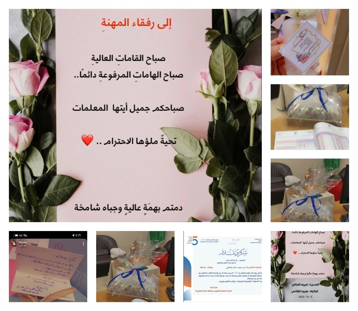 نفذت روضات مكة الحكومية والأهلية التابعة لإدارة الطفولة المبكرة بالإدارة العامة للتعليم بمنطقة مكة المكرمة يومي الأربعاء والخميس الموافق 9 – 10 / 3 / 1444هـ، فعاليات اليوم العالمي للمعلم تحت شعار (التحول في التعليم يبدأ مع المعلمين) من قبل إدارات الروضة والأطفال بإشراف مديرة الإدارة زكية الصبحي.