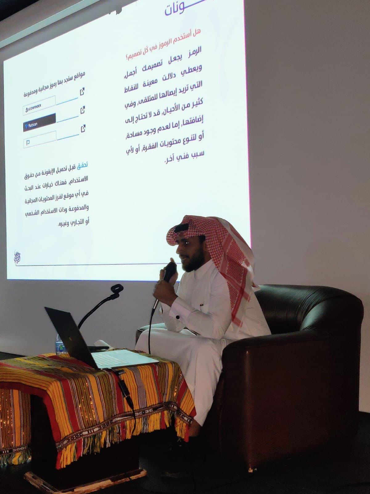 وتطرق المدرب لجانب التصميم الإعلامي حسب كل وسيلة إعلامية، ومصادر ملحقات التصميم من ألوان وصور وأيقونات وشعارات وتصاميم مفتوحة وغيرها.