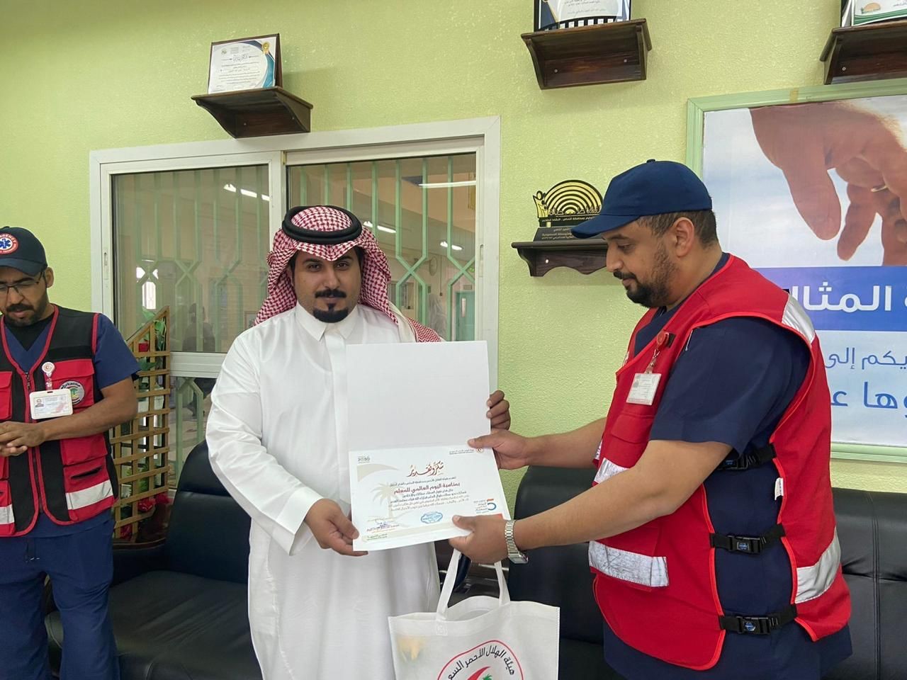 كما وقام مركز اسعاف النماص بعمل محاضرة توعوية عن أهمية تعلم الاسعافات الأولية لعدد من مدارس المحافظة وتم توزيع الهدايا للمعلمين وتقديم الشكر والثناء لهم على جهودهم.