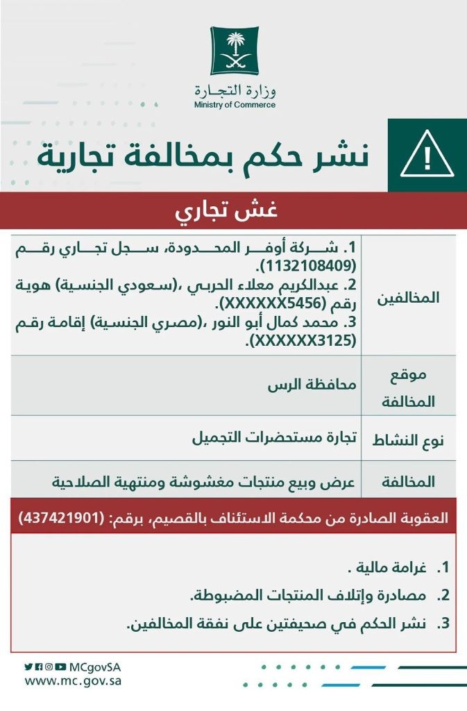 شهّرت وزارة التجارة بشركة تختص في تجارة مستحضرات التجميل بمحافظة الرس بعد صدور حكم قضائي يدين المنشأة ومالكها والبائع بمخالفة نظام مكافحة الغش التجاري من خلال عرض وبيع منتجات مغشوشة ومنتهية الصلاحية.