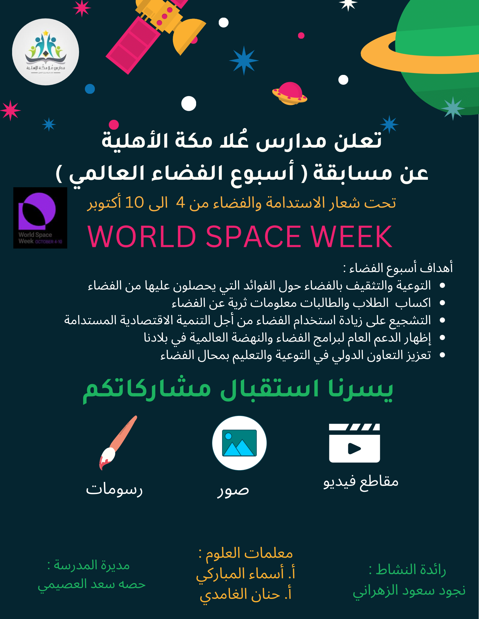 فعلت مدرسة علا مكة التابعة لمكتب تعليم غرب مكة بالإدارة العامة للتعليم بمنطقة مكة المكرمة أسبوع الفضاء (الفضاء والاستدامة) والذي بدأ الثلاثاء 8/3/1444هــ بهدف رفع مستوى التثقيف لدى الطالبات بمجال التخصصات العلمية، وتوعية وتثقيف الطالبات حول الفوائد التي يحصلن عليها من الفضاء والتعريف بمجالات وعلم الفلك، وإكسابهن مهارات ومعلومات ثرية في علوم الفضاء، وإظهار الدعم العام لبرامج الفضاء والنهضة العلمية في بلادنا .