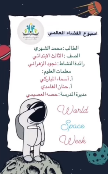 أعدت برنامج التفعيل رائدة النشاط نجود الزهراني ليشمل الإعلان في برامج التواصل الاجتماعي عن أسبوع الفضاء، وتخصيص حصص النشاط اللاصفي في تفعيل برامج عن الفلك والفضاء، كما خصصت إذاعة صباحية عن أسبوع الفضاء وتعريف الطالبات بأول رائد فضاء سعودي مسلم، إلى جانب مشاركة الطالبات في مسابقة أسبوع الفضاء التي تنوعت بين ( رسومات , صور , مقطع مرئي ) .