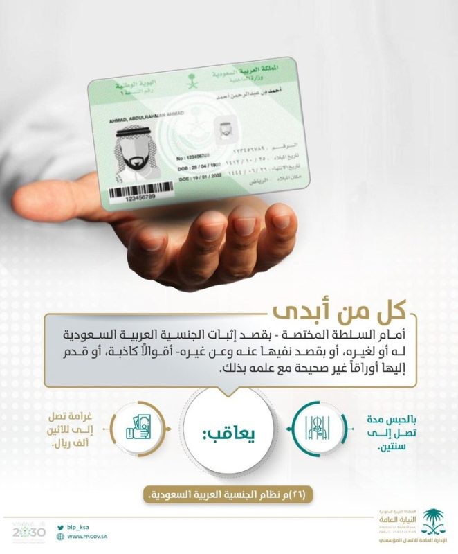 وأضافت النيابة العامة “أن كل من أبدى أمام السلطة المختصة، بقصد إثبات الجنسية السعودية له أو غيره أو بقصد نفيها عنه وعن غيره، أقوالًا كاذبة أو قدم إليها أوراقًا غير صحيحة مع علمه بذلك، فإنه يعاقب: بالحبس مدة تصل إلى سنتين، أو غرامة تصل إلى ثلاثين ألف ريال.