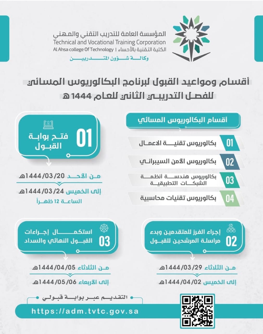 أعلنت الكلية التقنية بالأحساء عن فتح التسجيل للفصل التدريبي الثاني من العام 1444هـ في برنامج البكالوريوس المسائي لخريجي الدبلوم اعتباراً من الأحد 20 / 3 / 1444هـ ويستمر إلى الخميس 24 / 3 / 1444هـ الساعة 12 ظهراً ، عبر البوابة الإلكترونية "قبولي" بموقع المؤسسة العامة للتدريب التقني والمهني ( https://adm-tvtc.medad.com/registration )
