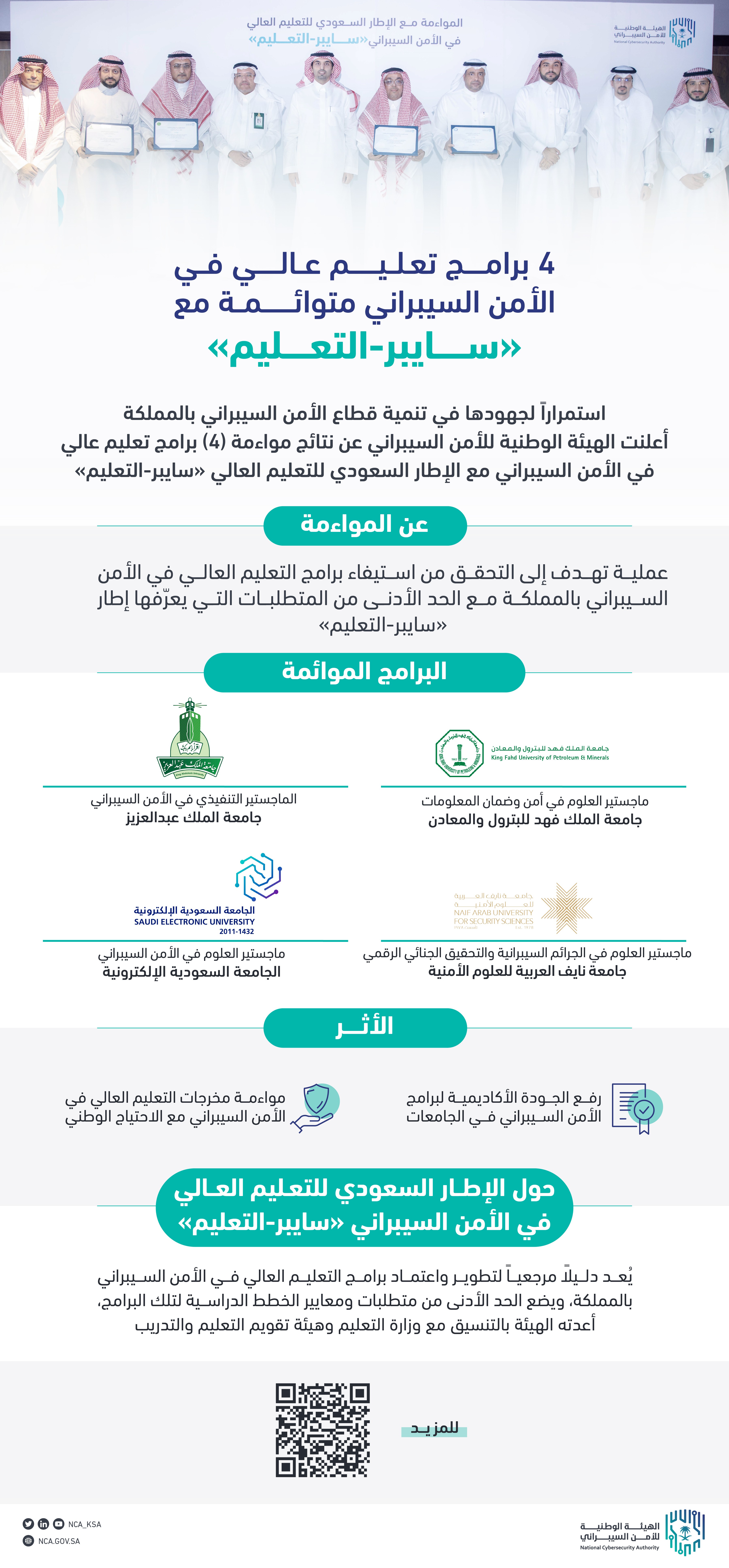 وكشفت الهيئة خلال مناسبة أقيمت لتسليم وثائق اعتماد المواءمة للجامعات، عن البرامج المستوفية للمعايير والمتطلبات التي يعرفها إطار «سايبر التعليم» وهي: «ماجستير العلوم في أمن وضمان المعلومات لدى جامعة الملك فهد للبترول والمعادن، وبرنامج الماجستير التنفيذي في الأمن السيبراني لدى جامعة الملك عبد العزيز، وبرنامج ماجستير العلوم في الجرائم السيبرانية والتحقيق الجنائي الرقمي لدى جامعة نايف العربية للعلوم الأمنية، وبرنامج ماجستير العلوم في الأمن السيبراني في الجامعة السعودية الإلكترونية».