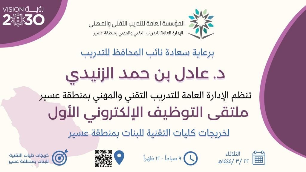 يدشن سعادة نائب محافظ المؤسسة العامة للتدريب التقني والمهني للتدريب الدكتور عادل الزنيدي غدآ الثلاثاء ملتقى التوظيف الإلكتروني الأول لخريجات الكليات التقنية للبنات بمنطقة عسير.