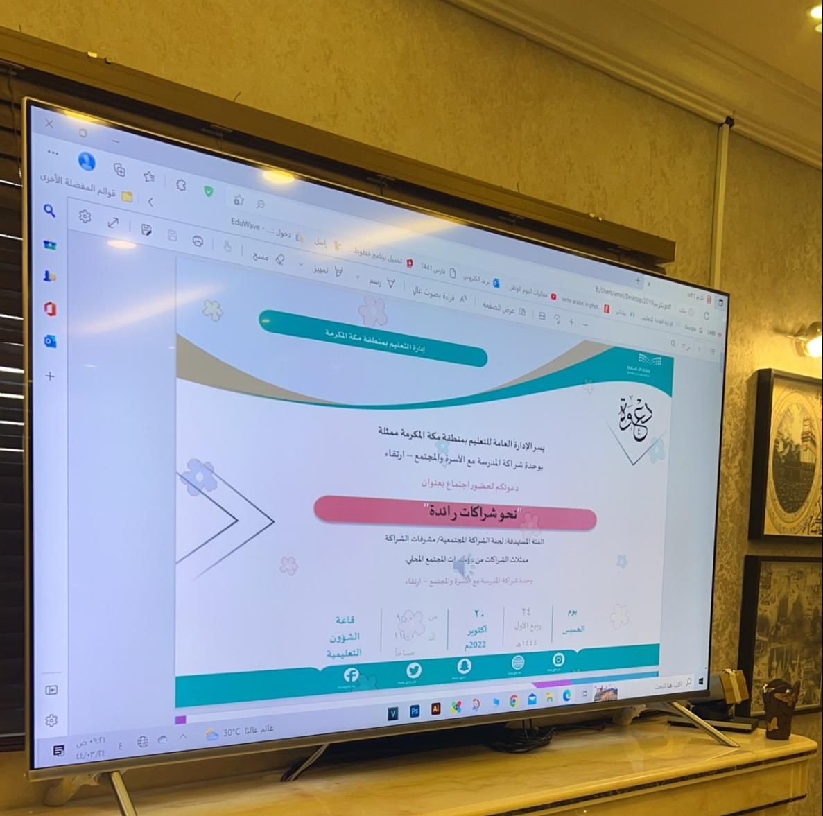 بحضور مساعدة مدير عام التعليم للشؤون التعليمية أ. لمياء بشاوري عقدت الإدارة العامة للتعليم بمنطقة مكة المكرمة ممثلةً في وحدة الشراكة مع الأسرة والمجتمع "ارتقاء" اجتماعًا بعنوان "نحو شراكة رائدة " اليوم الخميس الموافق 1444/3/24هـ بقاعة الشؤون التعليمية تحت إشراف مديرة الوحدة بدرية الغامدي وذلك بحضور كل من ممثلة مكتب يواقيت للاستشارات التعليمية والتربوية المستشارة التربوية أ.ماجدة صديقي و مديرة برنامج (هاجر) بمشروع تعظيم البلد الحرام أ.منال الجابري ورئيسة مجلس إدارة جمعية يسر للتنمية الأسرية بمكة المكرمة د.هيفاء فدا وقد حضرت بالنيابة عنها أ. ميسر جنة وعدد من الإدارات المعنية بالشراكة .