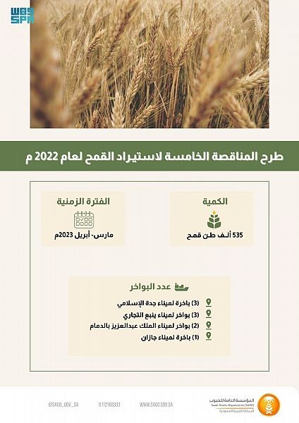 أعلنت المؤسسة العامة للحبوب اليوم عن طرح المناقصة الخامسة لاستيراد القمح لهذا العام، وذلك لكمية (535) ألف طن للتوريد خلال الفترة ( مارس – أبريل 2023م).