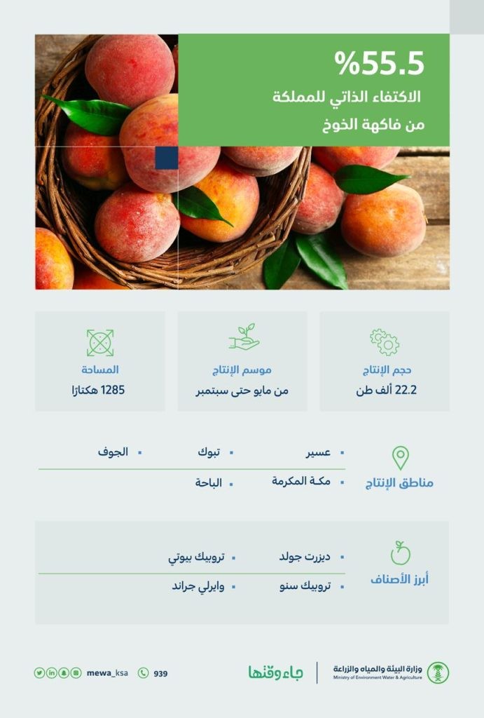 أعلنت وزارة البيئة والمياه والزراعة، عن وصول إنتاج المملكة من فاكهة الخوخ إلى 22.2 ألف طن سنويًّا، محقّقًة بذلك اكتفاءً ذاتيًّا منه بنسبة 55.5%، مشيرة إلى أن الخوخ يُزرع في أكثر من خمس مناطق بالمملكة، في مساحة إجمالية تُقدّر بـ1285 هكتار.